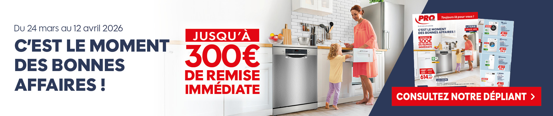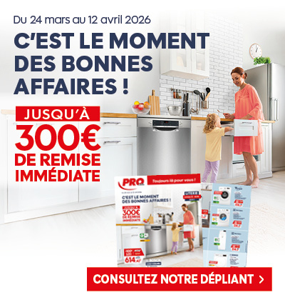 Ces offres exceptionnelles PRO&Cie sont disponibles du 23 mars au 12 avril 2026 seulement. Que ce soit pour votre cuisine, votre chambre, votre buanderie ou votre salon, ce catalogue vous permet de faire les bons choix au bon moment et de vous équiper malin.